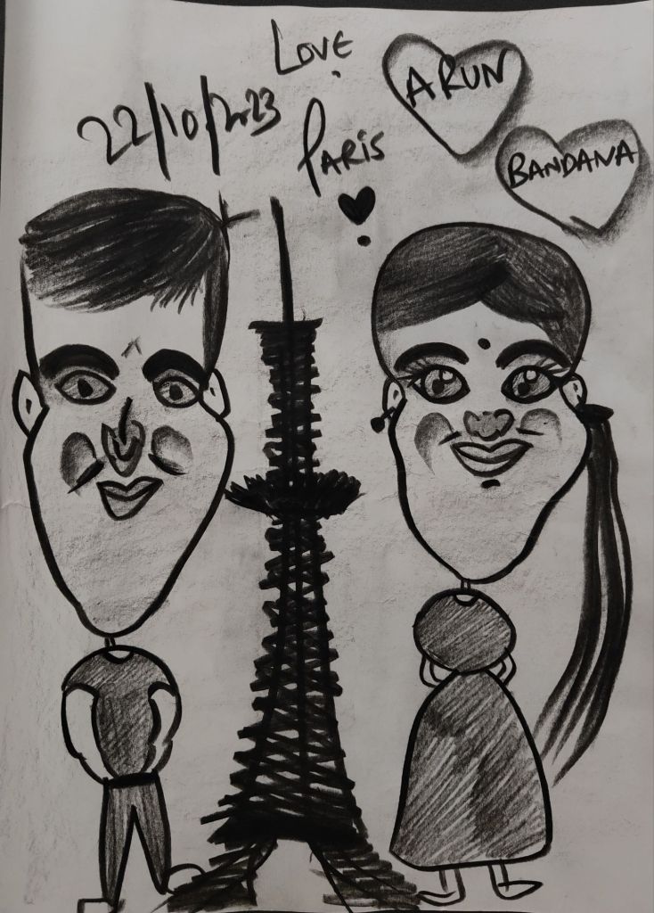 रविवार का दिन था। चारो ओर चहल-पहल थी। हमारे ठीक पास एक ईरानी कलाकार लोगों का कार्टून बना रहा था। हम पति-पत्नी ने भी वहाँ खड़े होकर अपना कार्टून बनवाया। कलाकार ने उसपर Love in Paris लिख दिया।